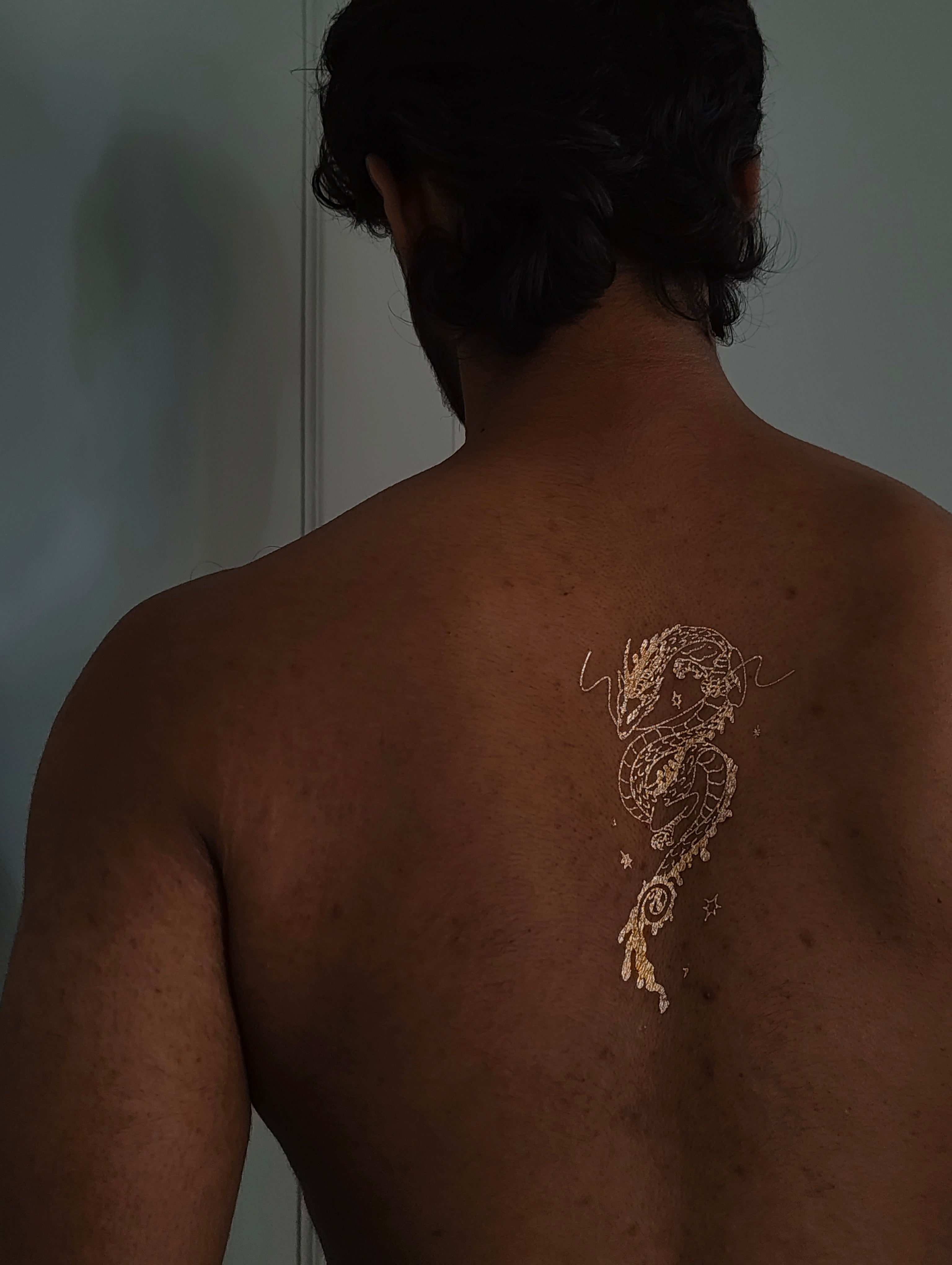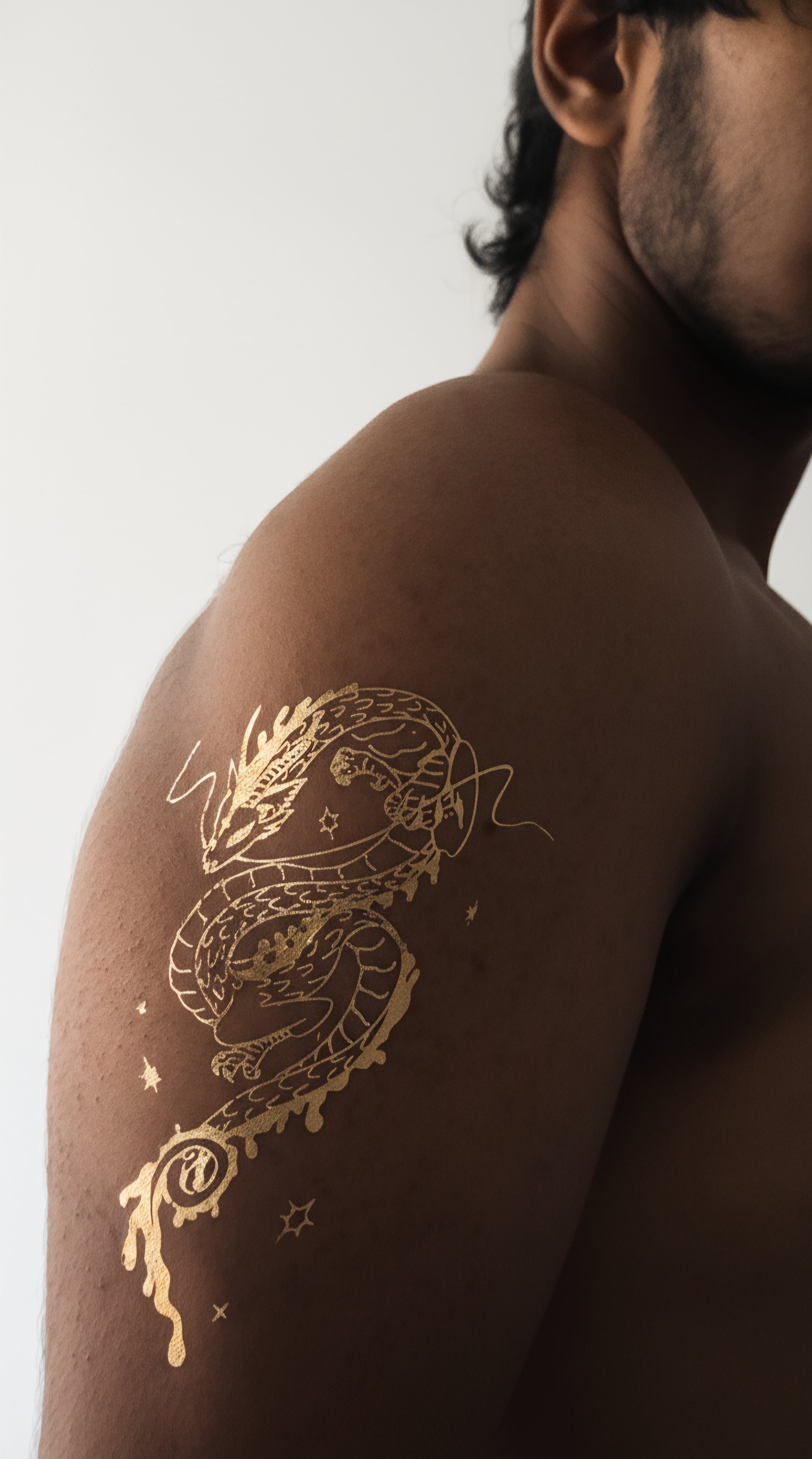 Crafted as a premium metallic temporary tattoo, this design captures the mythical essence of dragons whose very breath turned to liquid gold, their scales forged from starlight and their wisdom distilled into flowing, molten form.