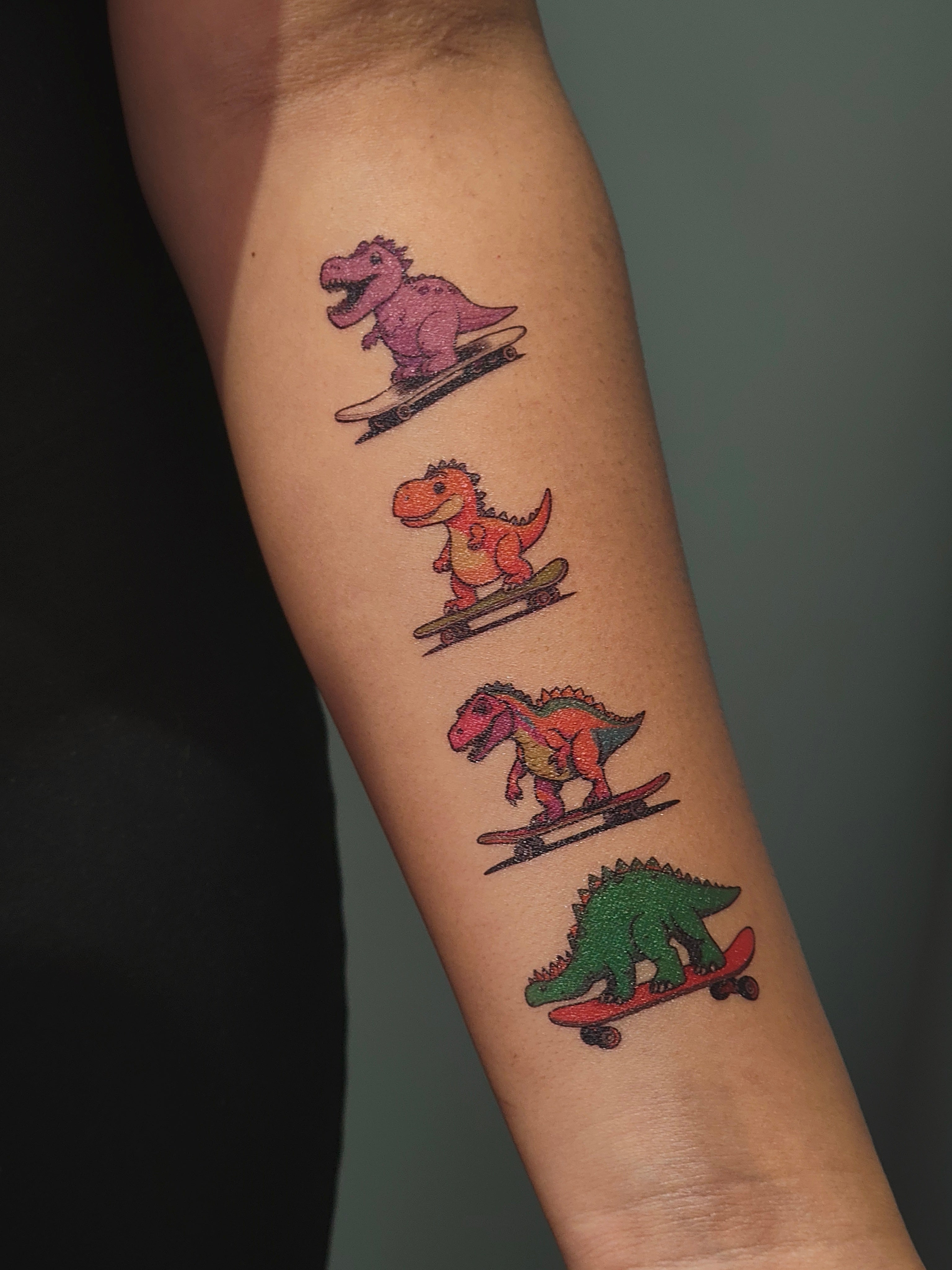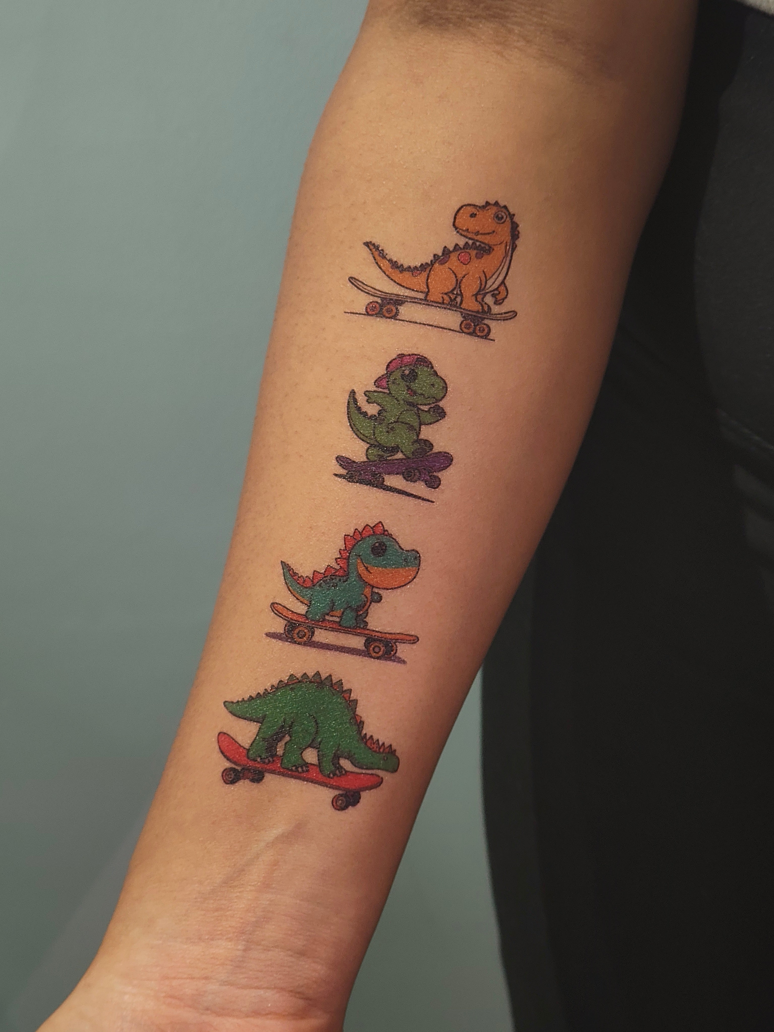 • A crew of dinosaur skateboarders in vibrant colors, symbolizing timeless fun, fearless adventure, and never being too old to try something new